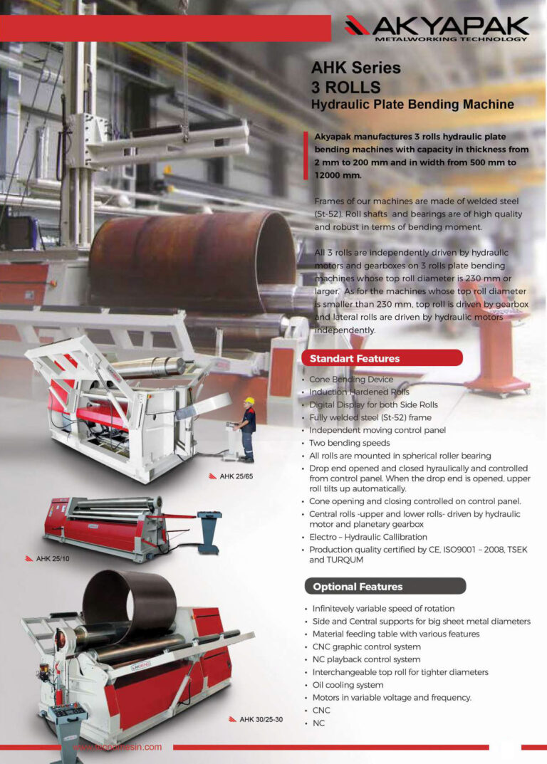 AKYAPAK manufactures 3 rolls hydraulic plate bending machines with capacity in thickness from 2mm to 200mm and in widht from 500mm to 12000mm